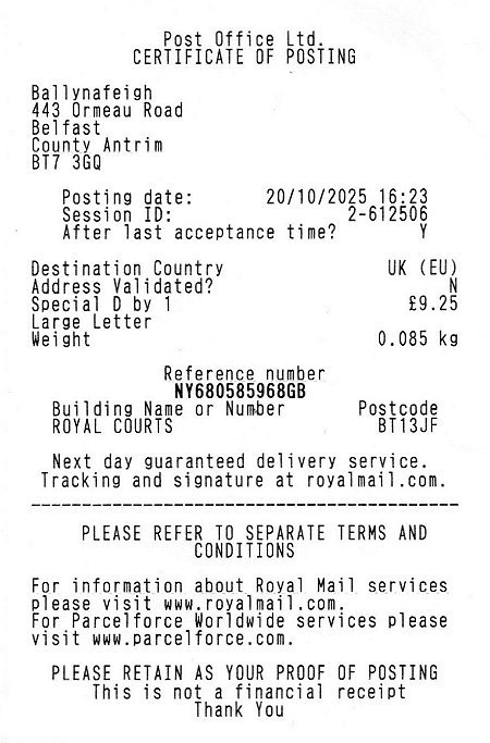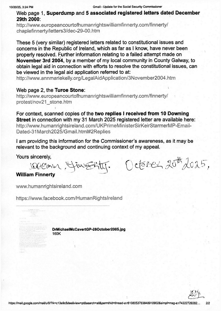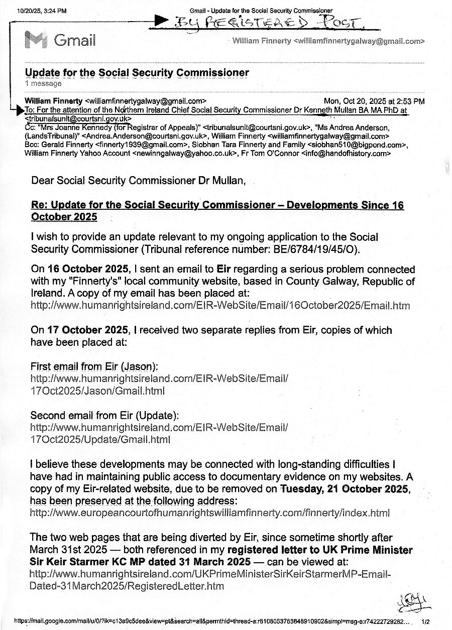 REGISTERED LETTER DATED OCTOBER 20TH 2025 TO NORTHERN IRELAND CHIEF SOCIAL SECURITY COMMISSIONER DR KENNETH MULLAN: