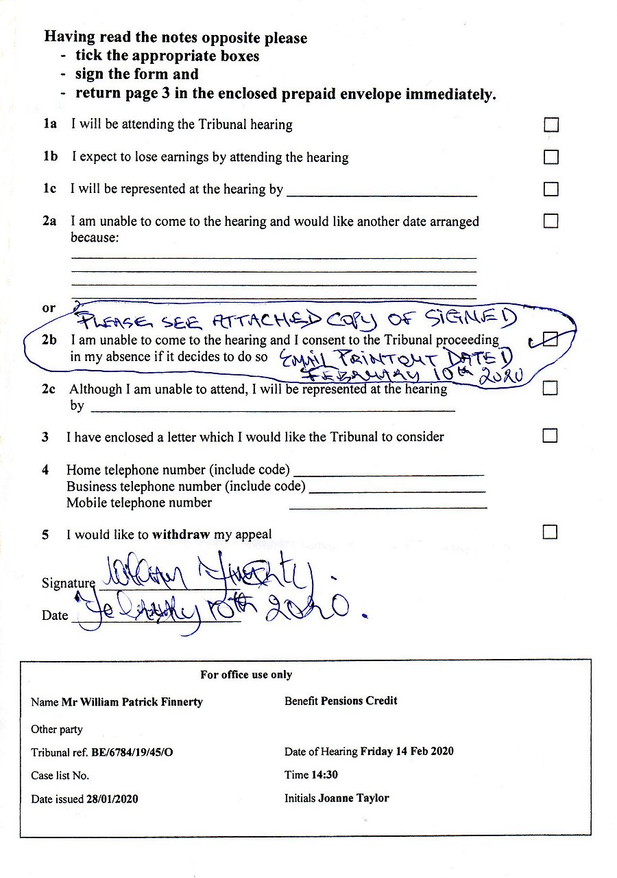 consenting to the Tribunal Hearing proceeding in my absence, if the