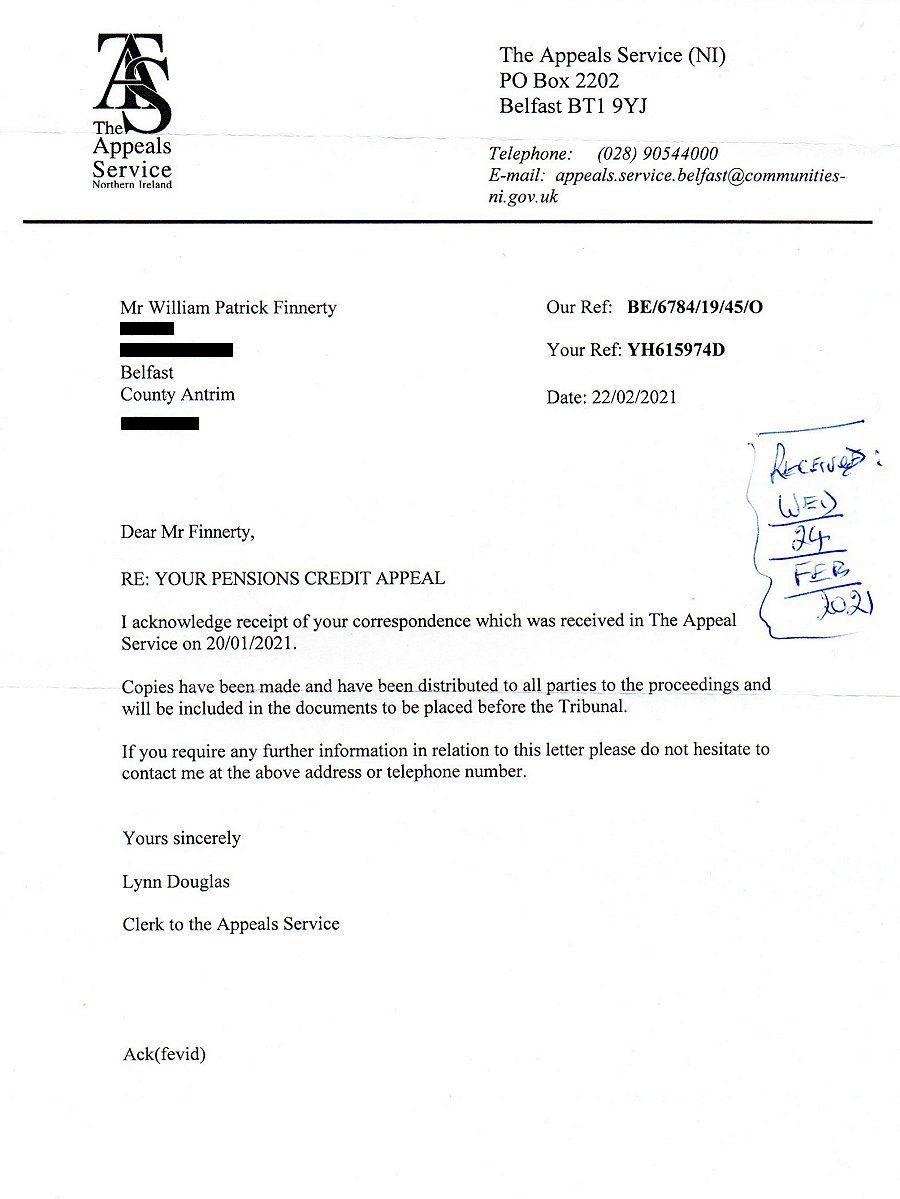 LETTER FROM THE APPEALS SERVICE (NORTHERN