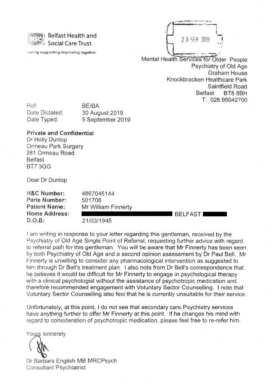 Letter dictated on August 30th 2019 by Consultant Psychiatrist Dr Barbra English