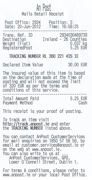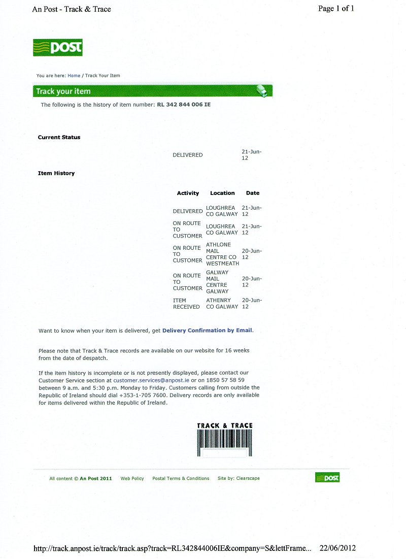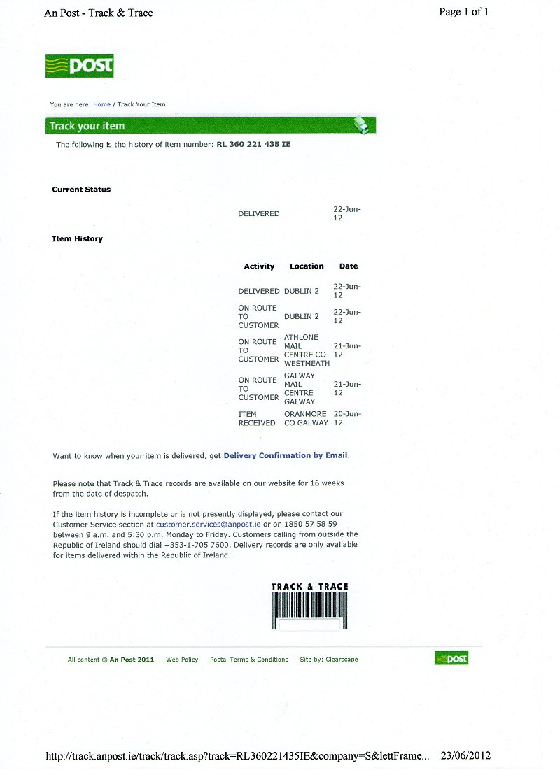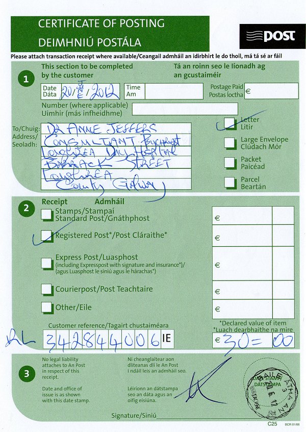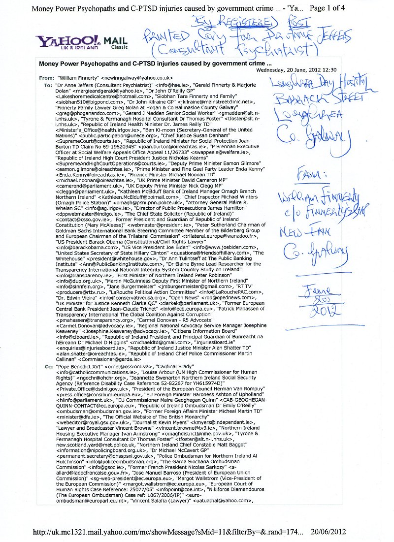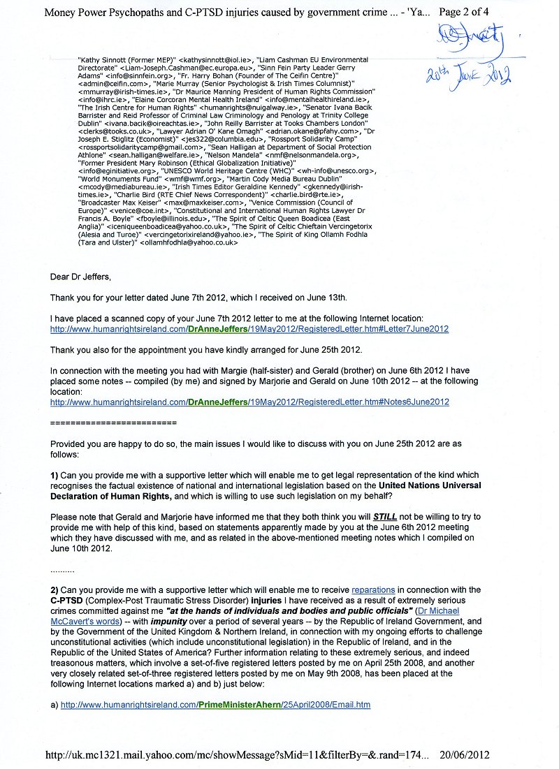 Scanned copy of e-mail printout sent by registered post to Dr Anne Jeffers on June 20th 2012: |