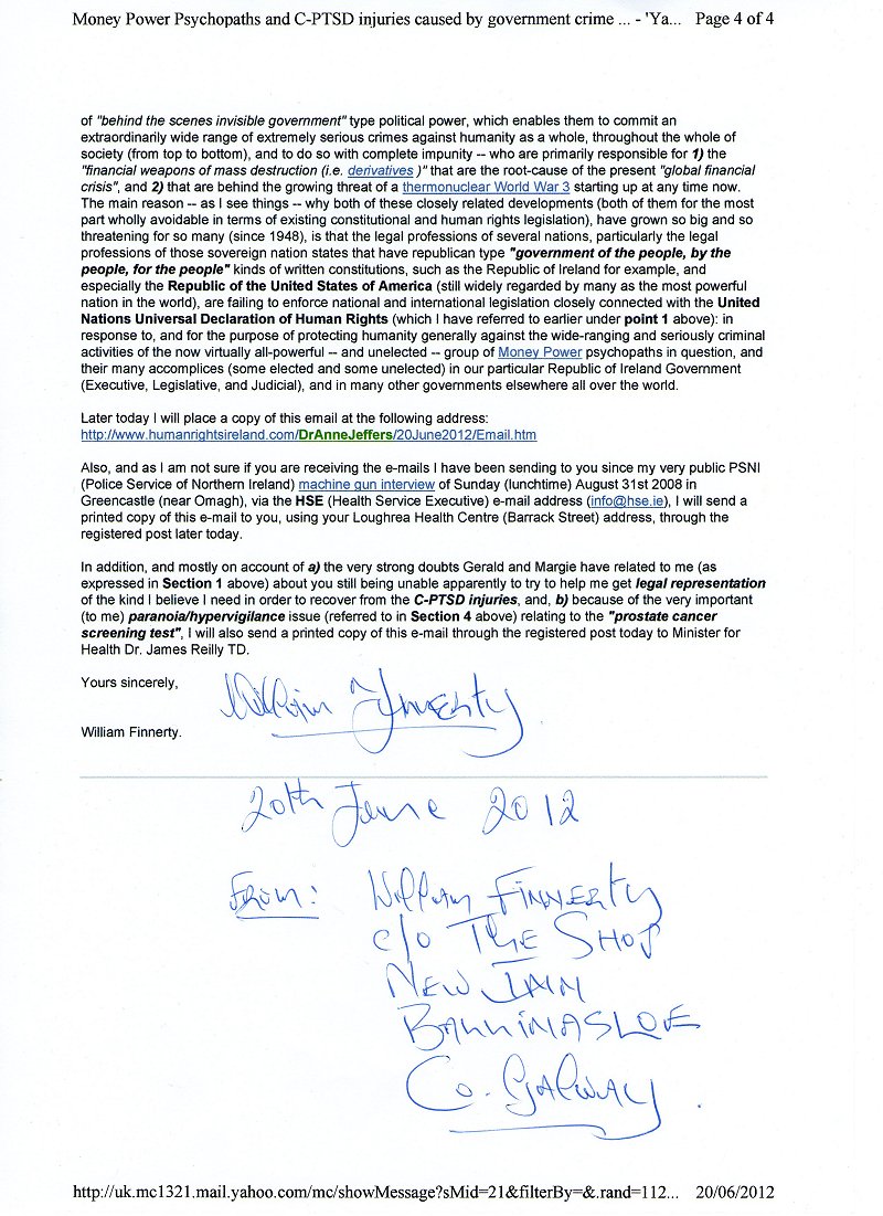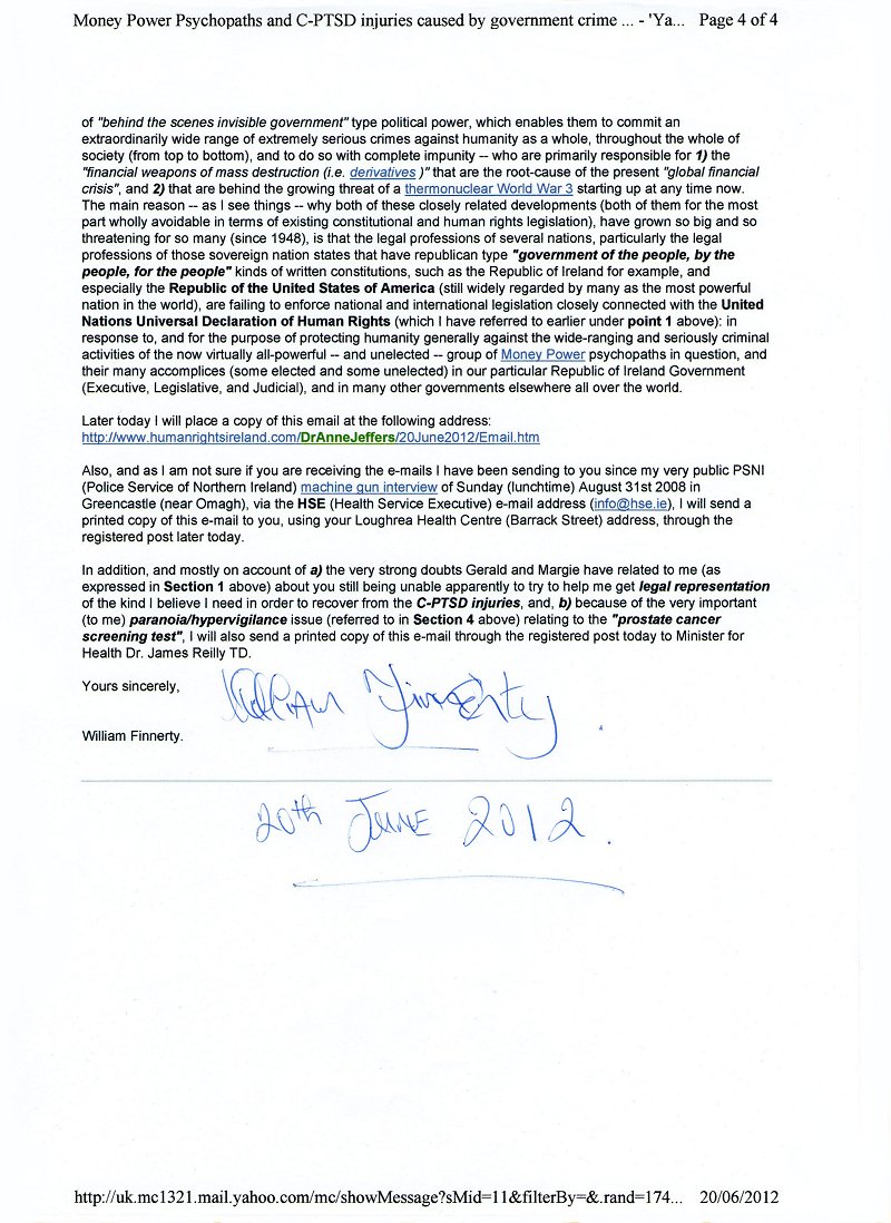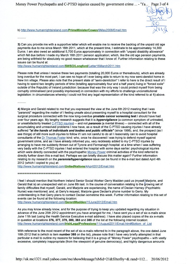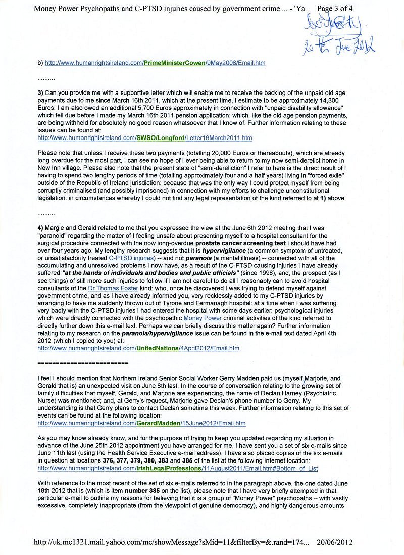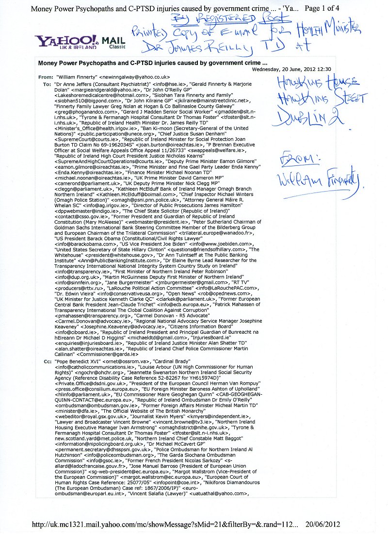 Scanned copy of e-mail printout sent by registered post to Minister for Health Dr James Reilly TD on June 20th 2012: |