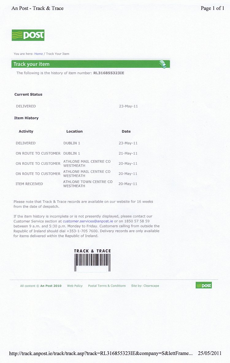 | The delivery date (May 23rd 2011) can be verified via the Post Office web site address just below: |