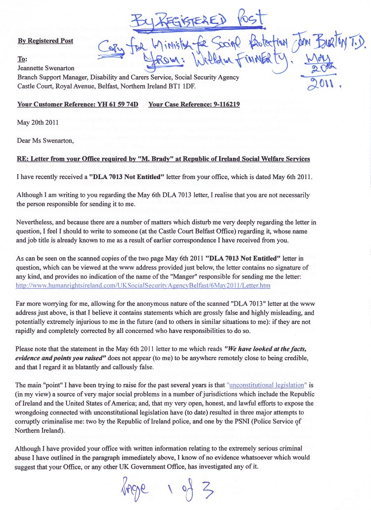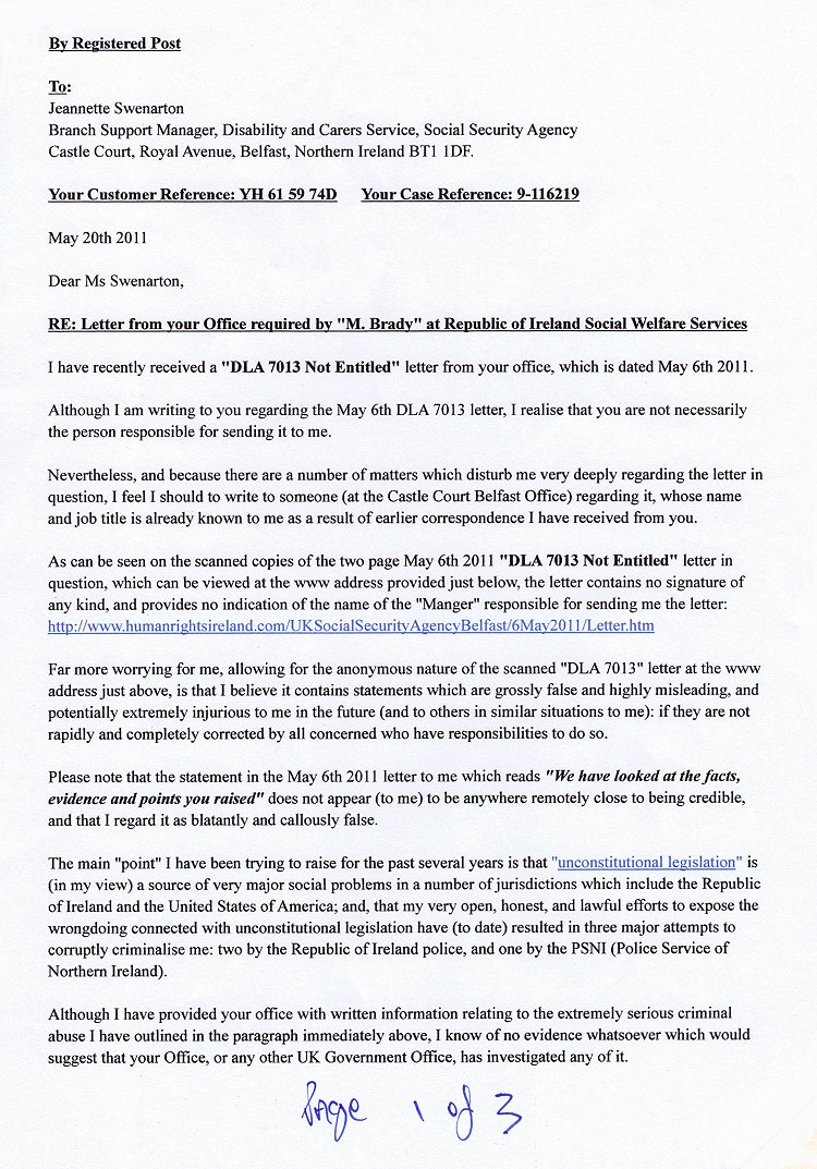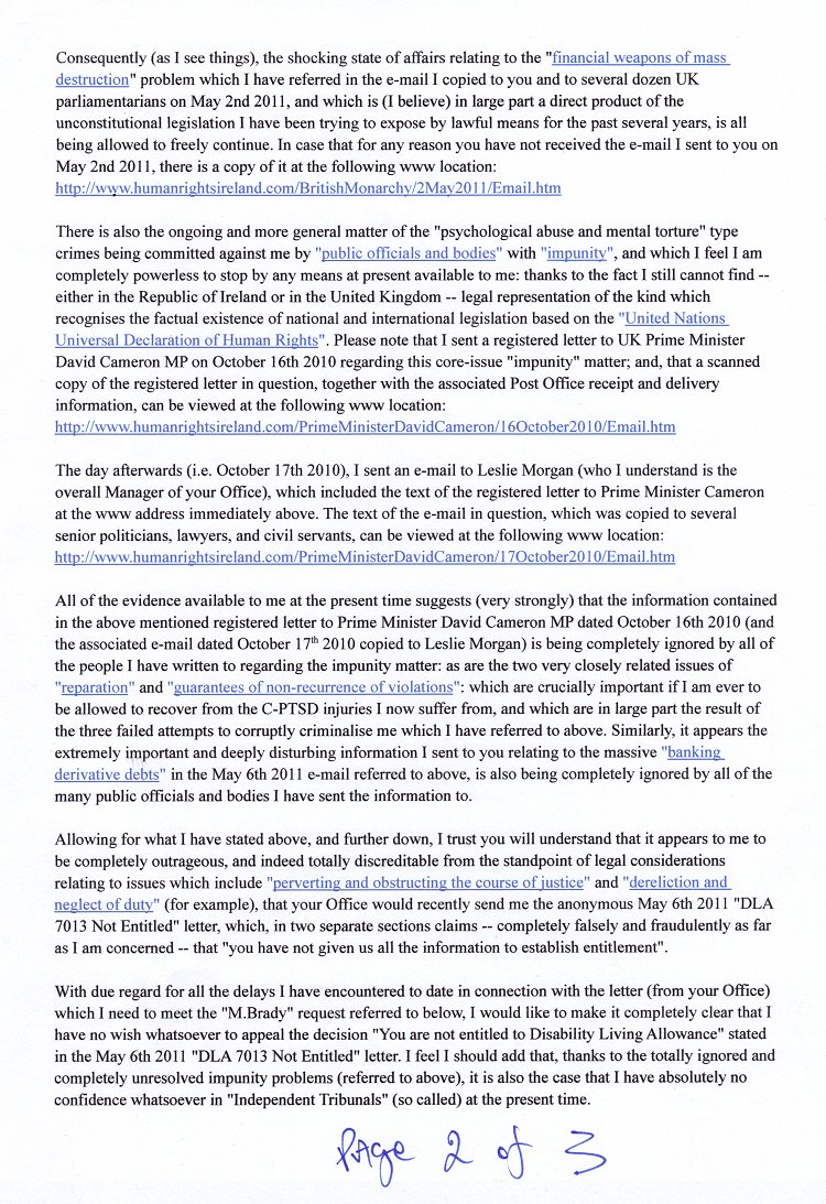 | By Registered Post To: Jeannette Swenarton Branch Support Manager, Disability and Carers Service, Social Security Agency Castle Court, Royal Avenue, Belfast, Northern Ireland BT1 1DF. Your Customer Reference: YH 61 59 74D Your Case Reference: 9-116219 May 20th 2011 Dear Ms Swenarton, RE: Letter from your Office required by "M. Brady" at Republic of Ireland Social Welfare Services I have recently received a "DLA 7013 Not Entitled" letter from your office, which is dated May 6th 2011. Although I am writing to you regarding the May 6th DLA 7013 letter, I realise that you are not necessarily the person responsible for sending it to me. Nevertheless, and because there are a number of matters which disturb me very deeply regarding the letter in question, I feel I should write to someone (at the Castle Court Belfast Office) regarding it, whose name and job title is already known to me as a result of earlier correspondence I have received from you. As can be seen on the scanned copies of the two page May 6th 2011 "DLA 7013 Not Entitled" letter in question, which can be viewed at the www address provided just below, the letter contains no signature of any kind, and provides no indication of the name of the "Manger" responsible for sending me the letter: http://www.humanrightsireland.com/UKSocialSecurityAgencyBelfast/6May2011/Letter.htm Far more worrying for me, allowing for the anonymous nature of the scanned "DLA 7013" letter at the www address just above, is that I believe it contains statements which are grossly false and highly misleading, and potentially extremely injurious to me in the future (and to others in similar situations to me): if they are not rapidly and completely corrected by all those concerned who have responsibilities to do so. Please note that the statement in the May 6th 2011 letter to me which reads "We have looked at the facts, evidence and points you raised" does not appear (to me) to be anywhere remotely close to being credible, and that I regard it as blatantly and callously false. The main "point" I have been trying to raise for the past several years is that "unconstitutional legislation" is (in my view) a source of very major social problems in a number of jurisdictions which include the Republic of Ireland and the United States of America; and, that my very open, honest, and lawful efforts to expose the wrongdoing connected with unconstitutional legislation have (to date) resulted in three major attempts to corruptly criminalise me: two by the Republic of Ireland police, and one by the PSNI (Police Service of Northern Ireland). Although I have provided your office with written information relating to the extremely serious criminal abuse I have outlined in the paragraph immediately above, I know of no evidence whatsoever which would suggest that your Office, or any other UK Government Office, has investigated any of it. Consequently (as I see things), the shocking state of affairs relating to the "financial weapons of mass destruction" problem which I have referred to in the e-mail I copied to you and to several dozen UK parliamentarians on May 2nd 2011, and which is (I believe) in large part a direct product of the unconstitutional legislation I have been trying to expose by lawful means for the past several years, is all being allowed to freely continue. In case that for any reason you have not received the e-mail I sent to you on May 2nd 2011, there is a copy of it at the following www location: http://www.humanrightsireland.com/BritishMonarchy/2May2011/Email.htm There is also the ongoing and more general matter of the "psychological abuse and mental torture" type crimes being committed against me by "public officials and bodies" with "impunity", and which I feel I am completely powerless to stop by any means at present available to me: thanks to the fact I still cannot find -- either in the Republic of Ireland or in the United Kingdom -- legal representation of the kind which recognises the factual existence of national and international legislation based on the "United Nations Universal Declaration of Human Rights". Please note that I sent a registered letter to UK Prime Minister David Cameron MP on October 16th 2010 regarding this core-issue "impunity" matter; and, that a scanned copy of the registered letter in question, together with the associated Post Office receipt and delivery information, can be viewed at the following www location: http://www.humanrightsireland.com/PrimeMinisterDavidCameron/16October2010/Email.htm The day afterwards (i.e. October 17th 2010), I sent an e-mail to Leslie Morgan (who I understand is the overall Manager of your Office), which included the text of the registered letter to Prime Minister Cameron at the www address immediately above. The text of the e-mail in question, which was copied to several senior politicians, lawyers, and civil servants, can be viewed at the following www location: http://www.humanrightsireland.com/PrimeMinisterDavidCameron/17October2010/Email.htm All of the evidence available to me at the present time suggests (very strongly) that the information contained in the above mentioned registered letter to Prime Minister David Cameron MP dated October 16th 2010 (and the associated e-mail dated October 17th 2010 copied to Leslie Morgan) is being completely ignored by all of the people I have written to regarding the impunity matter: as are the two very closely related issues of "reparation" and "guarantees of non-recurrence of violations": which are crucially important if I am ever to be allowed to recover from the C-PTSD injuries I now suffer from, and which are in large part the result of the three failed attempts to corruptly criminalise me which I have referred to above. Similarly, it appears the extremely important and deeply disturbing information I sent to you relating to the massive "banking derivative debts" in the May 6th 2011 e-mail referred to above, is also being completely ignored by all of the
