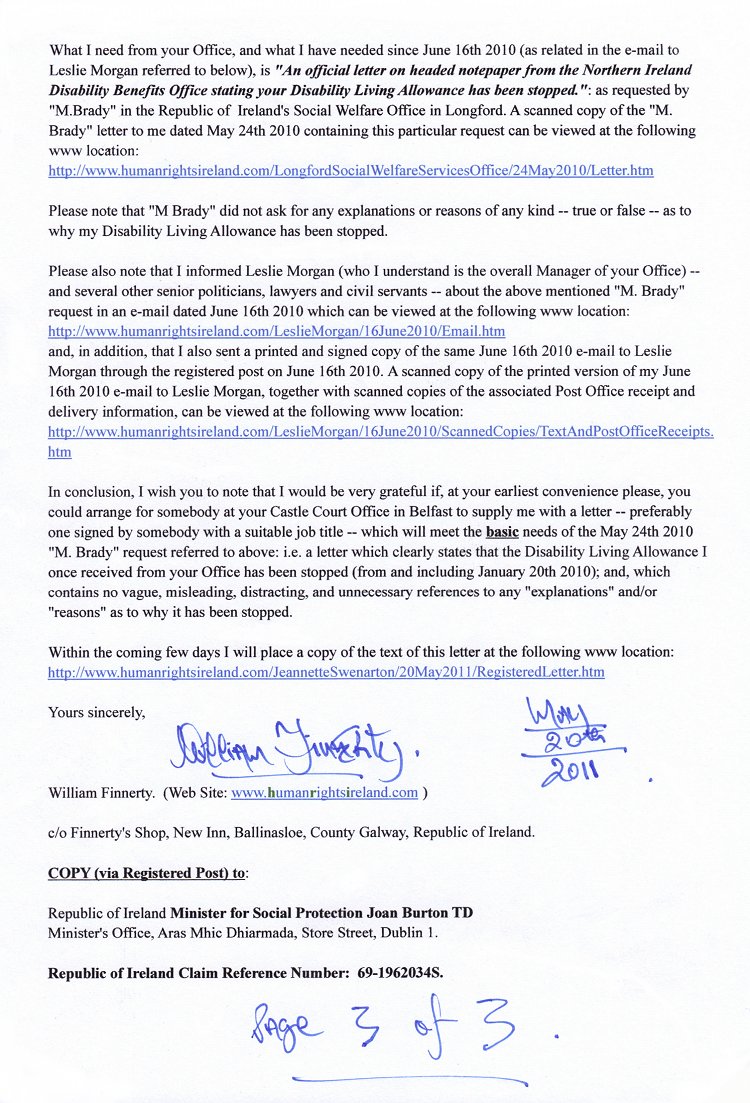 Scanned Copy of May 20th 2011 Registered Letter to Minister for Social Protection Joan Burton TD: |