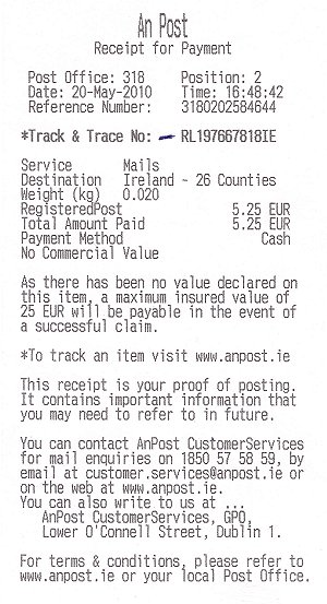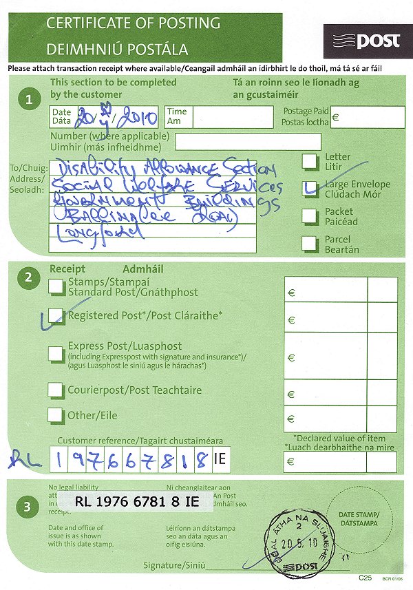 Letter to Social Welfare Services Office in Longford dated May 20th 2010