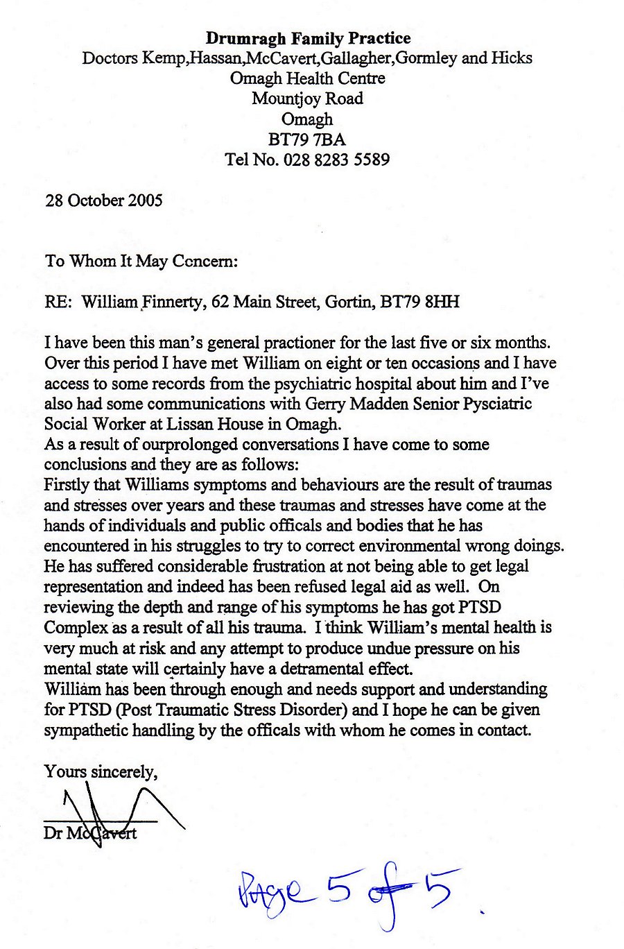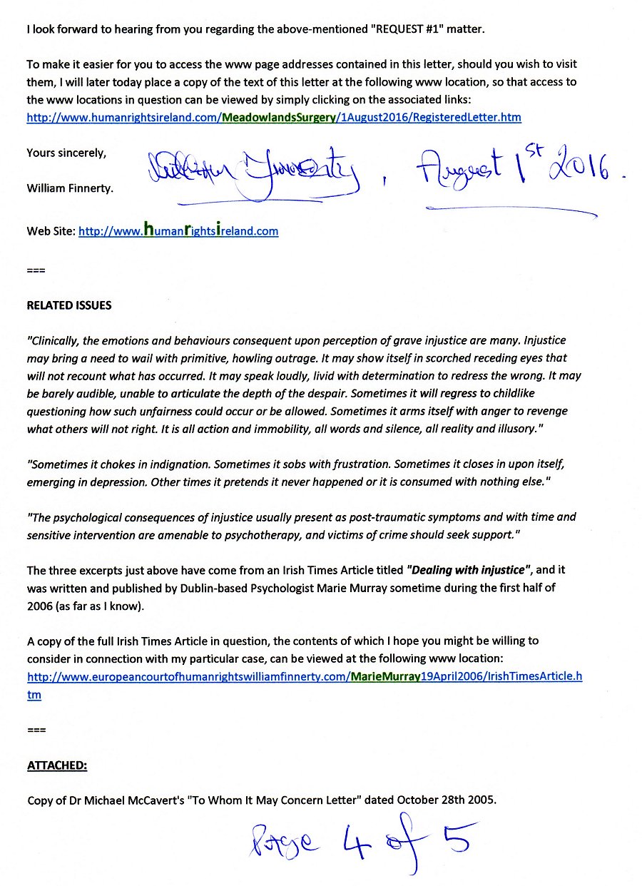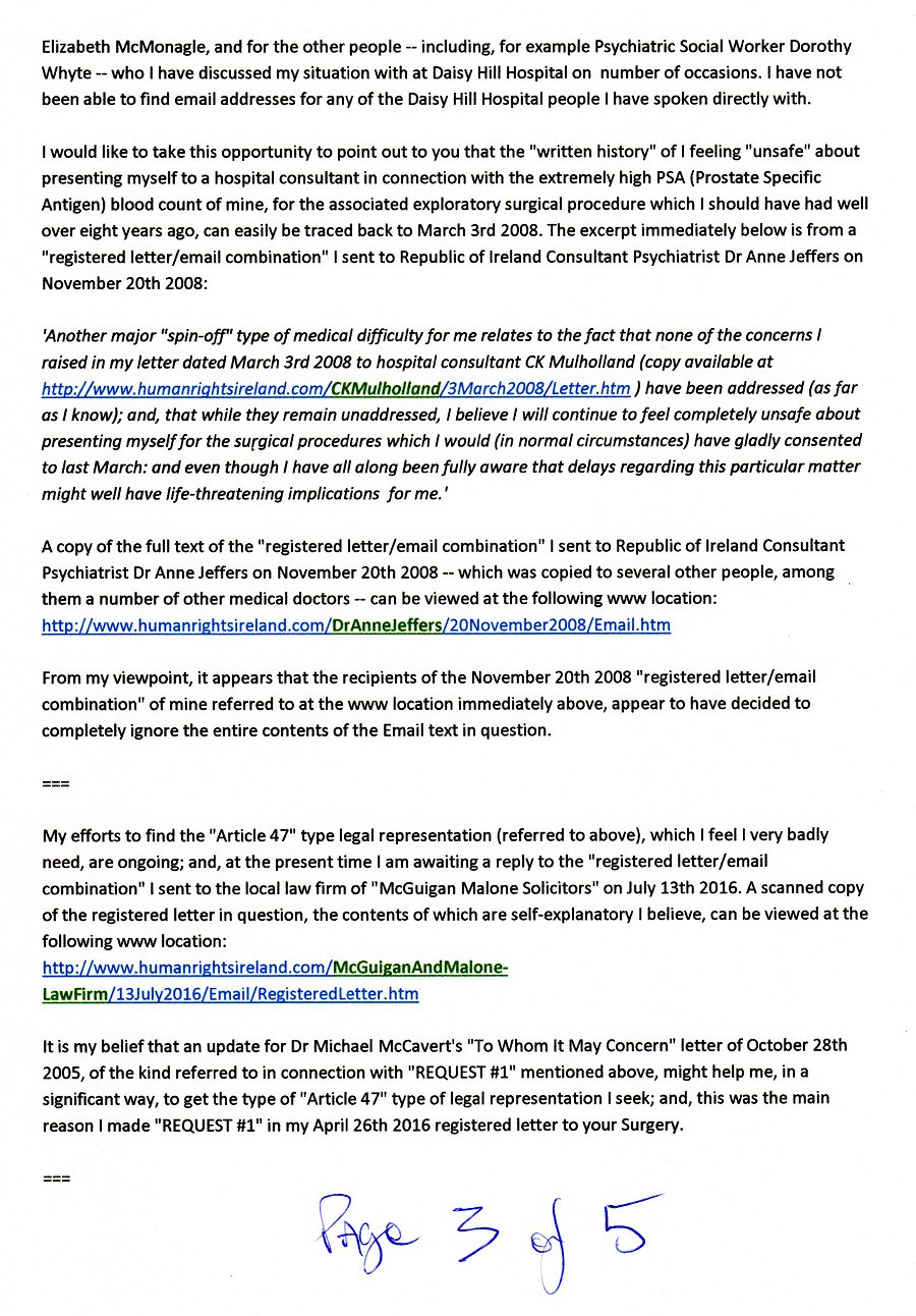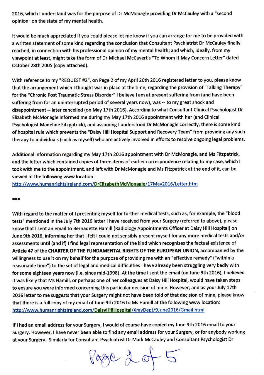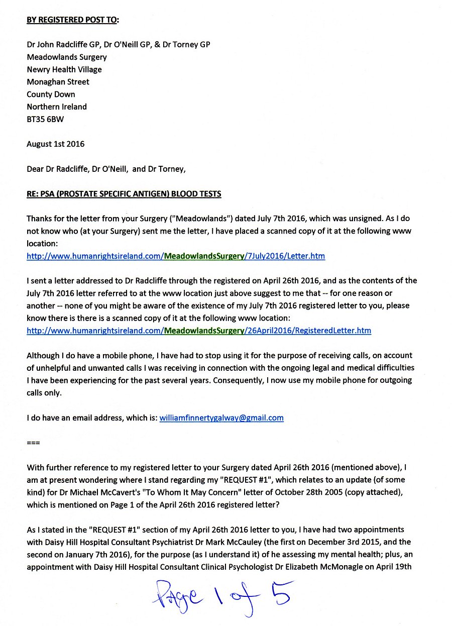 | BY REGISTERED POST TO: Dr John Radcliffe GP, Dr O'Neill GP, & Dr Torney GP Meadowlands Surgery Newry Health Village Monaghan Street County Down Northern Ireland BT35 6BW August 1st 2016 Dear Dr Radcliffe, Dr O'Neill, and Dr Torney, RE: PSA (PROSTATE SPECIFIC ANTIGEN) BLOOD TESTS Thanks for the letter from your Surgery ("Meadowlands") dated July 7th 2016, which was unsigned. As I do not know who (at your Surgery) sent me the letter, I have placed a scanned copy of it at the following www location: http://www.humanrightsireland.com/MeadowlandsSurgery/7July2016/Letter.htm I sent a letter addressed to Dr Radcliffe through the registered on April 26th 2016, and as the contents of the July 7th 2016 letter referred to at the www location just above suggest to me that -- for one reason or another -- none of you might be aware of the existence of my April 26th 2016 registered letter to you, please know there is there is a scanned copy of it at the following www location: http://www.humanrightsireland.com/MeadowlandsSurgery/26April2016/RegisteredLetter.htm Although I do have a mobile phone, I have had to stop using it for the purpose of receiving calls, on account of unhelpful and unwanted calls I was receiving in connection with the ongoing legal and medical difficulties I have been experiencing for the past several years. Consequently, I now use my mobile phone for outgoing calls only. I do have an email address, which is: williamfinnertygalway@gmail.com === With further reference to my registered letter to your Surgery dated April 26th 2016 (mentioned above), I am at present wondering where I stand regarding my "REQUEST #1", which relates to an update (of some kind) for Dr Michael McCavert's "To Whom It May Concern" letter of October 28th 2005 (copy attached), which is mentioned on Page 1 of the April 26th 2016 registered letter? As I stated in the "REQUEST #1" section of my April 26th 2016 letter to you, I have had two appointments with Daisy Hill Hospital Consultant Psychiatrist Dr Mark McCauley (the first on December 3rd 2015, and the second on January 7th 2016), for the purpose (as I understand it) of he assessing my mental health; plus, an appointment with Daisy Hill Hospital Consultant Clinical Psychologist Dr Elizabeth McMonagle on April 19th 2016, which I understand was for the purpose of Dr McMonagle providing Dr McCauley with a "second opinion" on the state of my mental health. It would be much appreciated if you could please let me know if you can arrange for me to be provided with a written statement of some kind regarding the conclusion that Consultant Psychiatrist Dr McCauley finally reached, in connection with his professional opinion of my mental health; and which, ideally, from my viewpoint at least, might take the form of Dr Michael McCavert's "To Whom It May Concern Letter" dated October 28th 2005 (copy attached). With reference to my "REQUEST #2", on Page 2 of my April 26th 2016 registered letter to you, please know that the arrangement which I thought was in place at the time, regarding the provision of "Talking Therapy" for the "Chronic Post Traumatic Stress Disorder" I believe I am at present suffering from (and have been suffering from for an uninterrupted period of several years now), was -- to my great shock and disappointment -- later cancelled (on May 17th 2016). According to what Consultant Clinical Psychologist Dr Elizabeth McMonagle informed me during my May 17th 2016 appointment with her (and Clinical Psychologist Madeline Fitzpatrick), and assuming I understood Dr McMonagle correctly, there is some kind of hospital rule which prevents the "Daisy Hill Hospital Support and Recovery Team" from providing any such therapy to individuals (such as myself) who are actively involved in efforts to resolve ongoing legal problems. Additional information regarding my May 17th 2016 appointment with Dr McMonagle, and Ms Fitzpatrick, and the letter which contained copies of three items of earlier correspondence relating to my case, which I took with me to the appointment, and left with Dr McMonagle and Ms Fitzpatrick at the end of it, can be viewed at the following www location: http://www.humanrightsireland.com/DrElizabethMcMonagle/17May2016/Letter.htm === With regard to the matter of I presenting myself for further medical tests, such as, for example, the "blood tests" mentioned in the July 7th 2016 letter I have received from your Surgery (referred to above), please know that I sent an email to Bernadette Hamill (Radiology Appointments Officer at Daisy Hill Hospital) on June 9th 2016, informing her that I felt I could not sensibly present myself for any more medical tests and/or assessments until (and if) I find legal representation of the kind which recognises the factual existence of Article 47 of the CHARTER OF THE FUNDAMENTAL RIGHTS OF THE EUROPEAN UNION, accompanied by the willingness to use it on my behalf for the purpose of providing me with an "effective remedy" ("within a reasonable time") for the set of legal and medical difficulties I have already been struggling very badly with for some eighteen years now (i.e. since mid-1998). At the time I sent the email (on June 9th 2016), I believed it was likely that Ms Hamill, or perhaps one of her colleagues at Daisy Hill Hospital, would have taken steps to ensure you were informed concerning this particular decision of mine. However, and as your July 7th 2016 letter to me suggests that your Surgery might not have been told of that decision of mine, please know that there is a full copy of my email of June 9th 2016 to Ms Hamill at the following www location: http://www.humanrightsireland.com/DaisyHillHospital/XrayDept/9June2016/Gmail.html If I had an email address for your Surgery, I would of course have copied my June 9th 2016 email to your Surgery. However, I have never been able to find any email address for your Surgery, or for anybody working at your Surgery. Similarly for Consultant Psychiatrist Dr Mark McCauley an