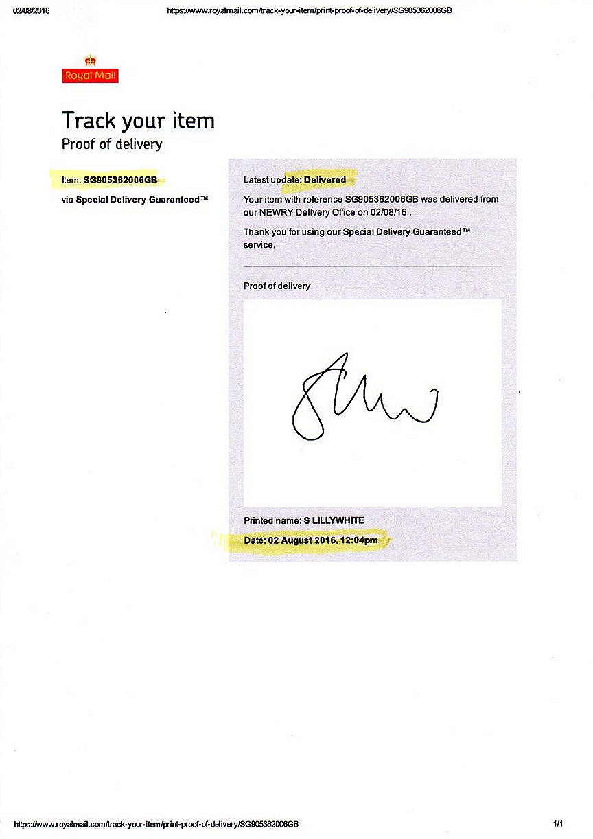 ROYAL MAIL PROOF OF DELIVERY NOTE |