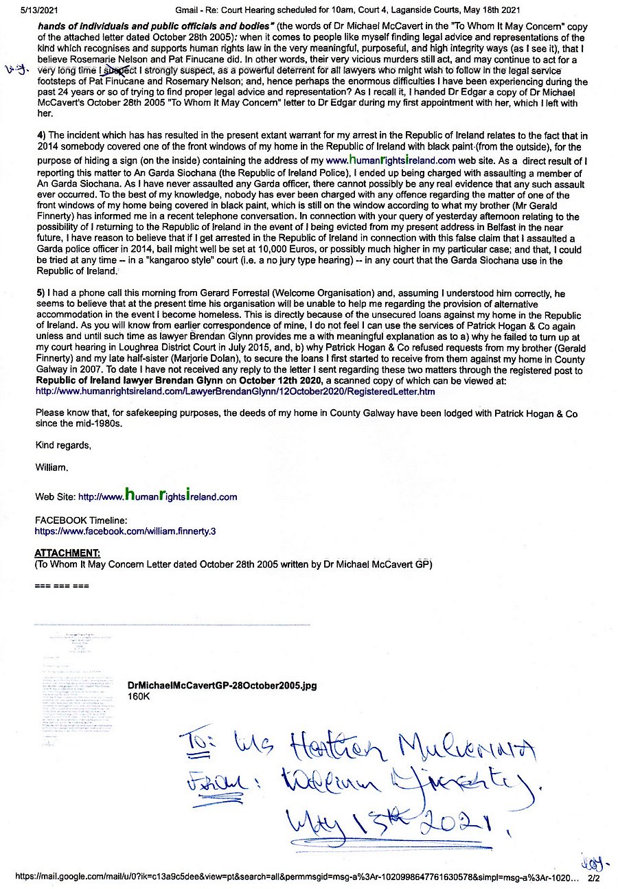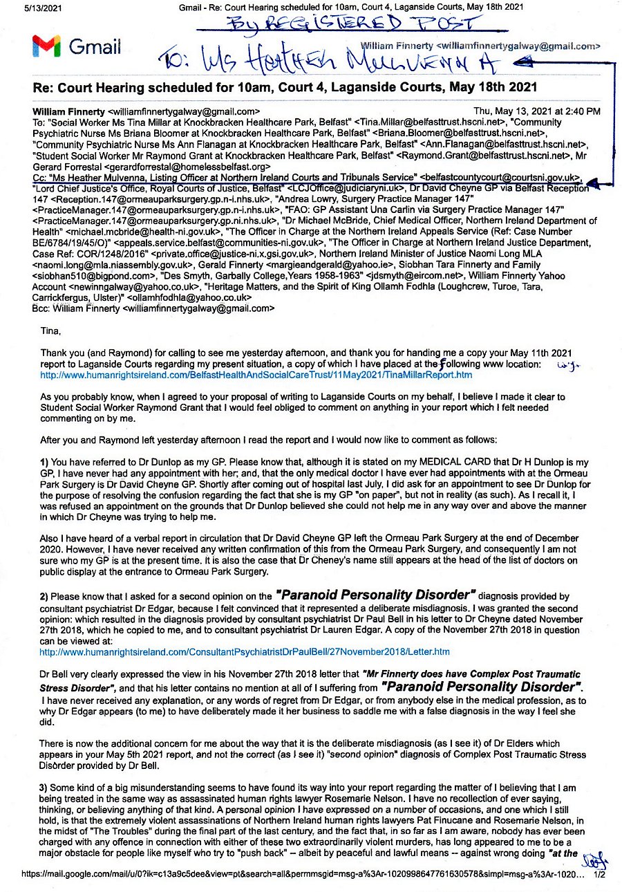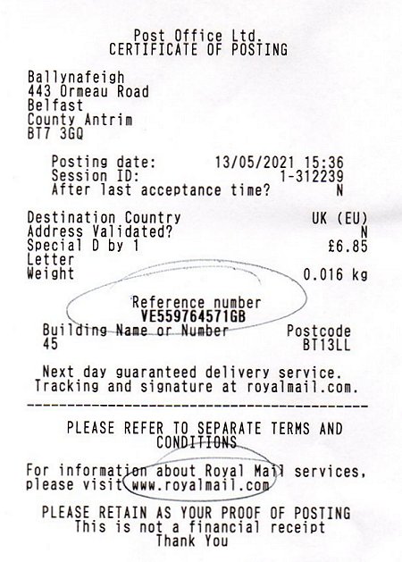 Certificate of Posting for May 13th Registered Letter to Listing Officer Ms Heather Mulvenna |