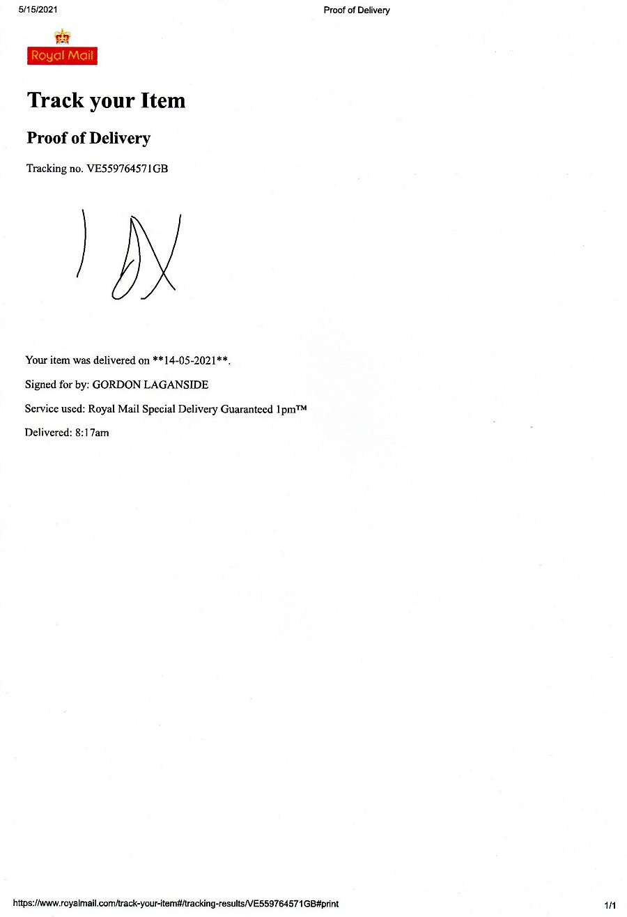 Proof of Delivery for May 13th Registered Letter to Listing Officer Ms Heather Mulvenna |