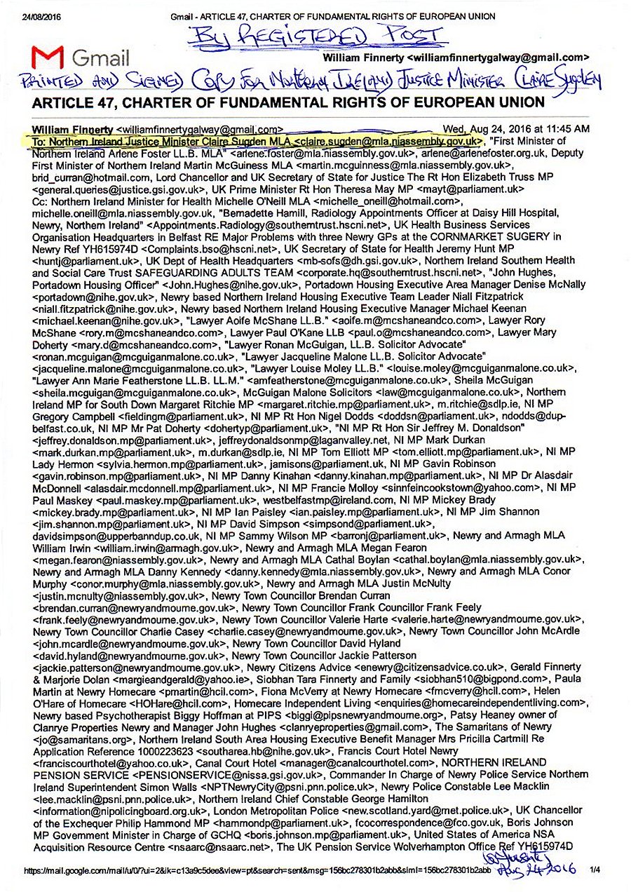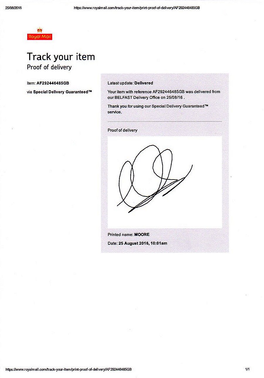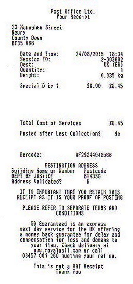 Registered Letter To Northern Ireland Justice Minister Claire Sugden MLA |