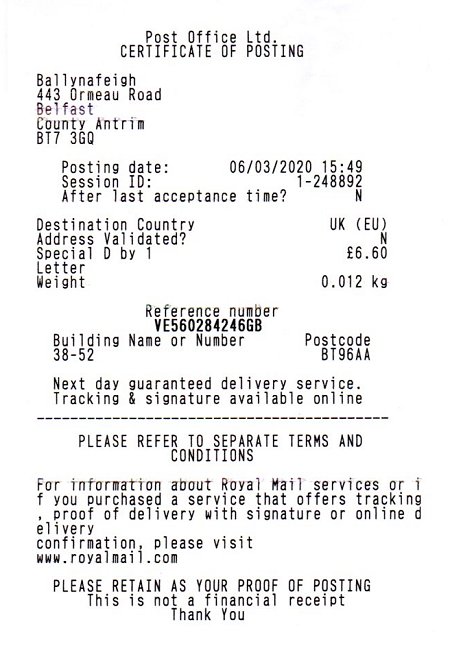 Royal Mail Post Office Receipt Reference Number: VE560284246GB |