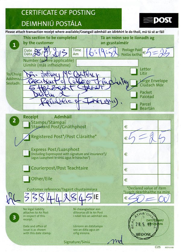 Set of Three Registered Letters sent to Three Senior Republic of Ireland Medical Doctors on May 28th 2013 |
