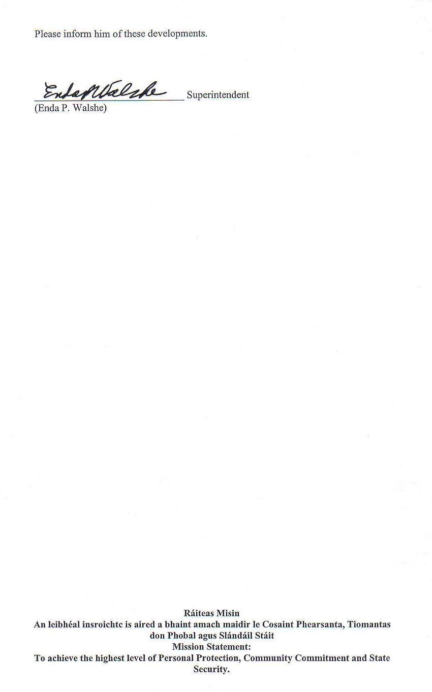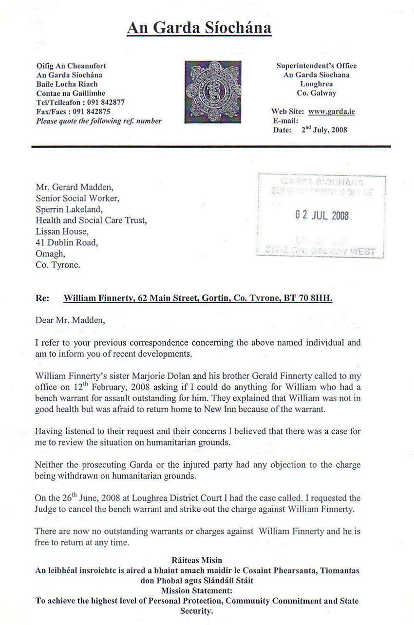 Letter from Superintendent Enda Walshe to Gerard Madden (Senior Social Worker) (Dated July 2nd 2008)